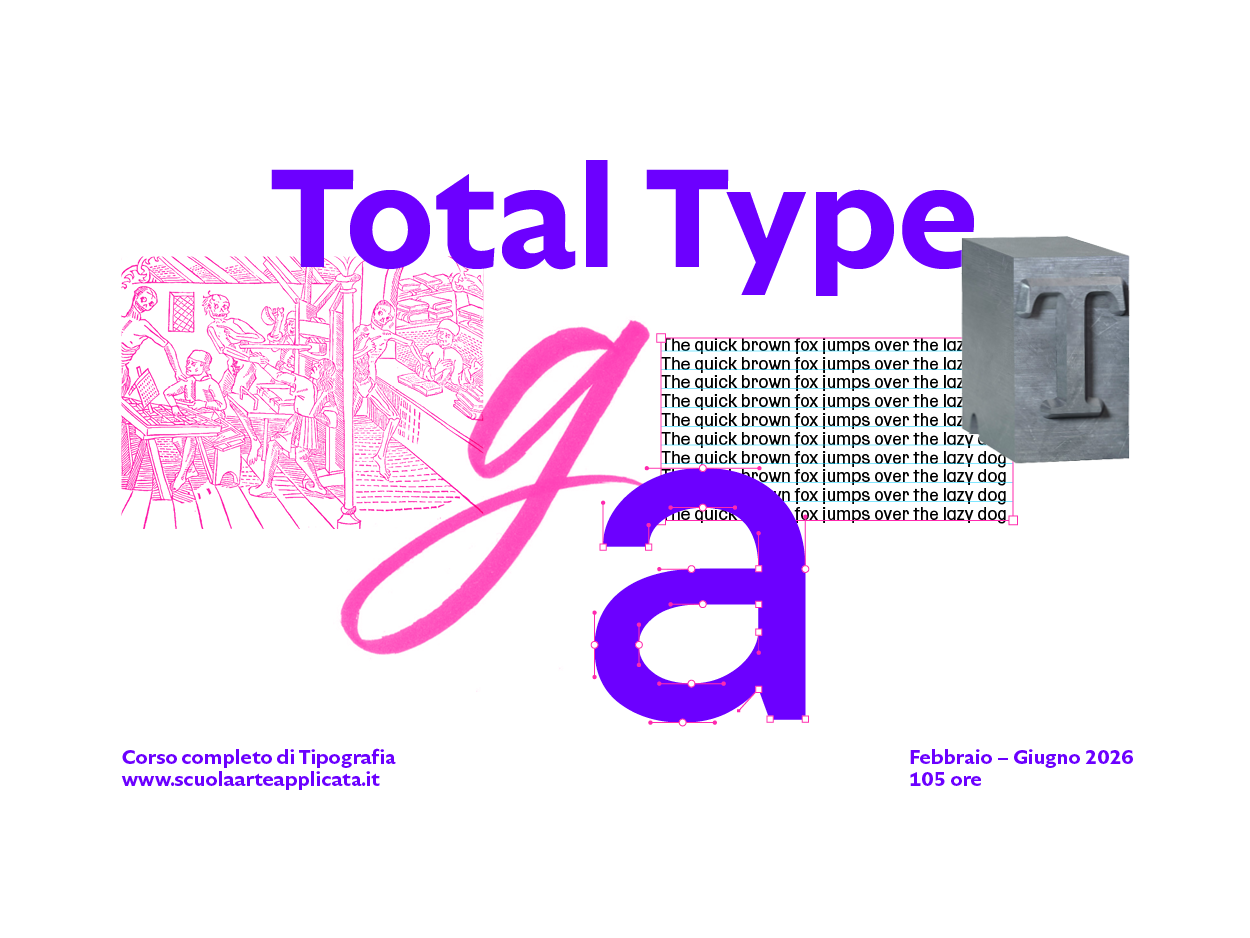 Total Type: corso professionale completo di tipografia Un corso completo diviso in cinque moduli che affronta in modo totale il mondo delle lettere. Partendo dalla loro storia e dalle loro evoluzioni, per passare al disegno calligrafico, alla stampa letterpress, al type design e alla progettazione editoriale, verrà approfondito ogni aspetto della tipografia. Un corso rivolto a tutt*, professionist*, student* e appassionat*. Parte il 4 febbraio e dura 105 ore, due lezioni a settimana.